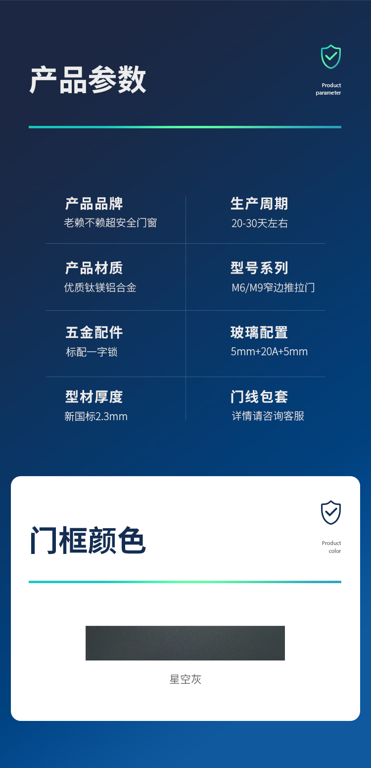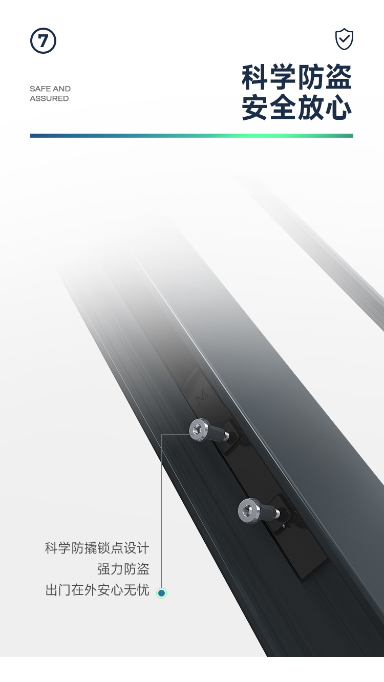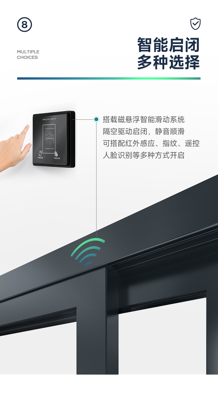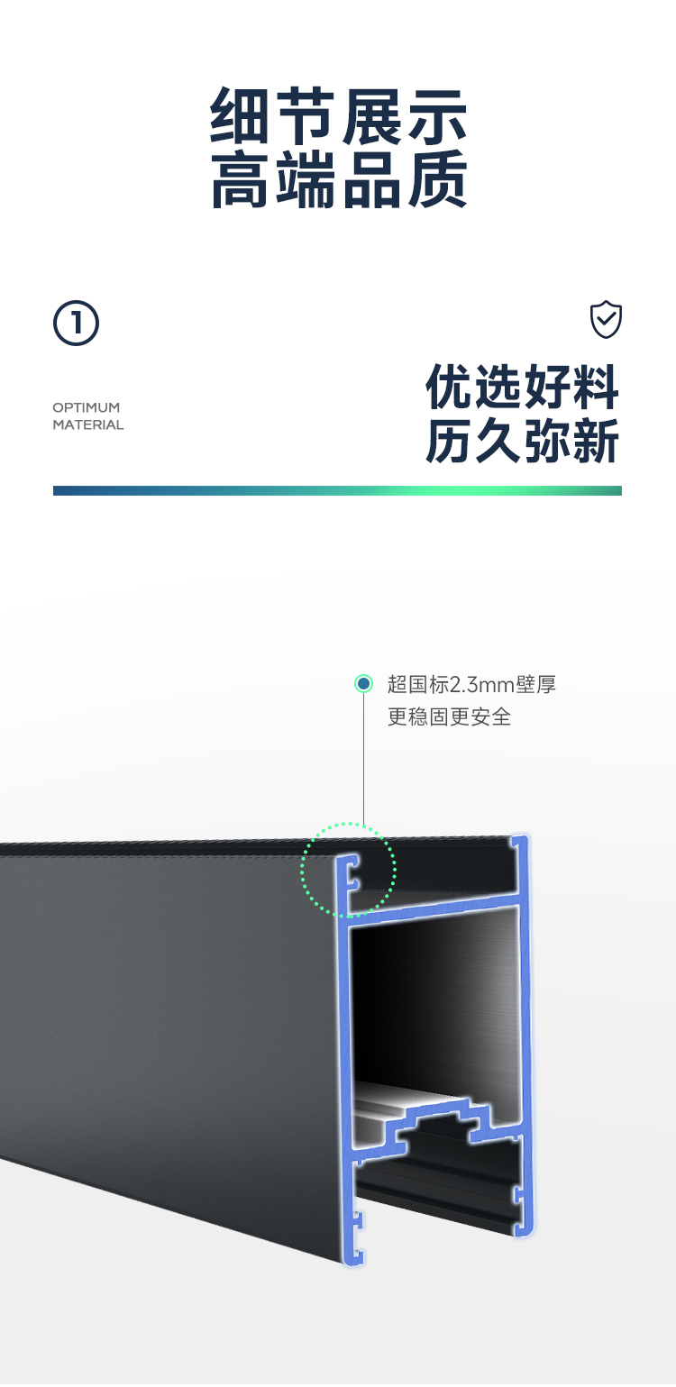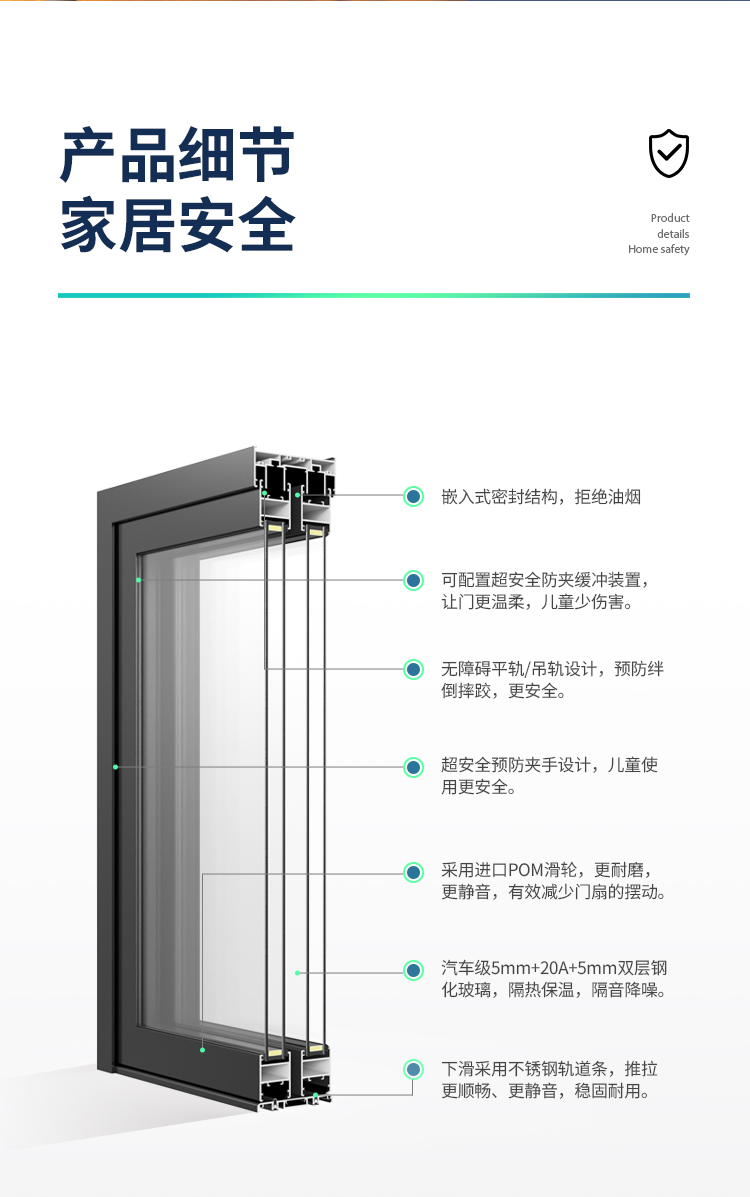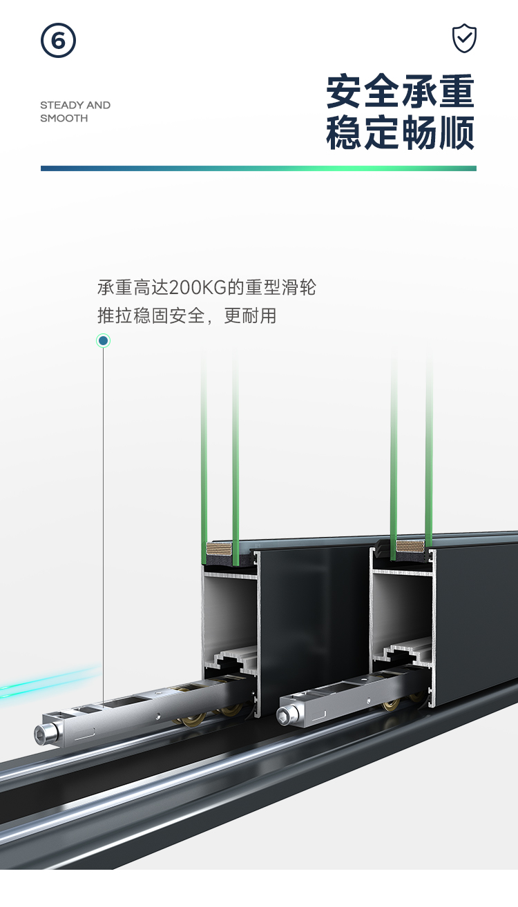 >新國標2.3mm壁厚;微邊大視野,5.0mm增強抗壓; >大中空鋼化玻璃,采用雙膠條減震密封設(shè)計,隔音效果更好; >超安全重型滑輪,承重200KG; >超安全防撬鎖點設(shè)計,更安全; >可配置超安全防夾緩沖裝置,讓門更溫柔,兒童少傷害; >防水軌道、無障礙平軌,滿足室內(nèi)外的不同需求; >磁懸浮升級款,盡享智慧生活。