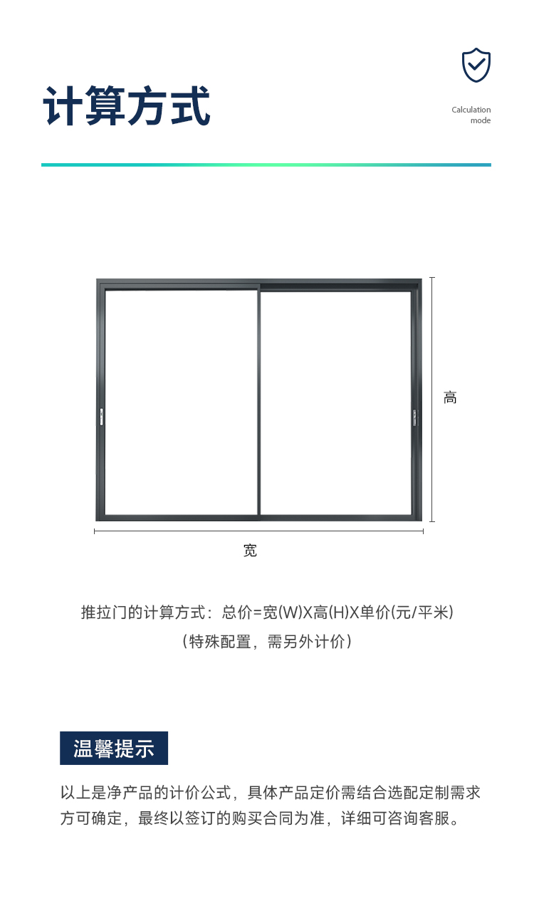 ■ 特殊配置(如包邊線、更換鎖具、訂制色等),需另行計價; ■ 最小單扇面積1.8㎡; ■ 以上單價不含運輸與安裝費、稅費; ■ 部分偏遠地區(qū)受物流影響價格上浮10%為合理現(xiàn)象;